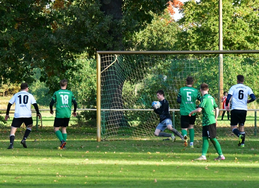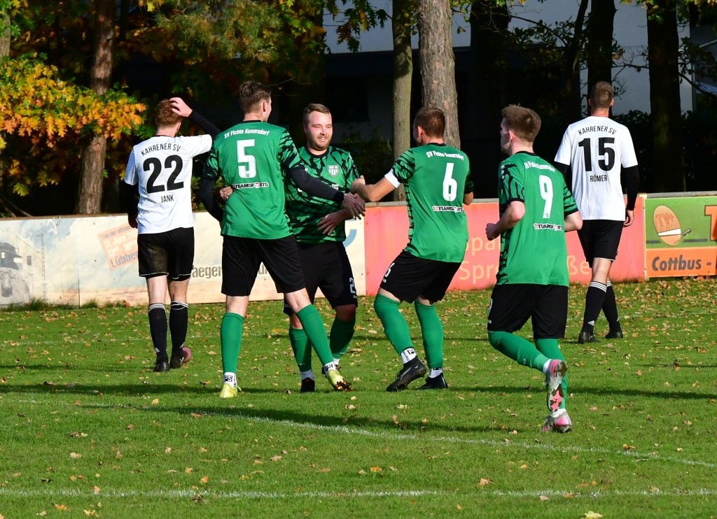 Am 7. Spieltag der Kreisoberliga musste Fichte zum Tabellenvorletzten nach Kahren reisen. Beim Gastgeber stand nur ein Pünktchen auf der Habenseite. Von der Papierform her Fichte klar der Favorit. Aber!!! Kunersdorf musste auf 3 Positionen improvisieren. Als erstes auf der Torwartposition. In den letzten 3 Spielen – drei verschiedene Torhüter!!! Dann musste auf der Sechs D. Veit ersetzt werden und mit Tobi Graske noch ein Angreifer. Für Fichte begann die Partie äußerst ungünstig. Schon nach 4 Minuten lag man mit 1:0 zurück, vorangegangenen ein hartes Einsteigen von Fichte Keeper Richter (wurde unnötig in Schwierigkeiten gebracht) kurz vor der Strafraumgrenze. Den fälligen Elfer verwandelte Adomeit sicher. Fichte sichtlich beeindruckt und brauchte dann ca. 10 Minuten um ins Spiel zu kommen. Nach einer reichlichen Viertelstunde Kunersdorf dann spielbestimmend und mit guten Torabschlüssen durch Dabow, Hagen und Gulbing. Nur der Ball wollte scheinbar nicht in die Maschen des Gegners gehen. In der 21. Minute dann der überfällige Ausgleichstreffer durch Gulbing. Fichte nun das klar bessere Team und Möglichkeiten zur Führung. Ein Konter in der 39. Minute von Kahren brachte sehr überraschend die erneute Führung für den Gastgeber. Nach einen Lattenklatscher konnte im Nachsetzen Wesche verwandelt werden. Aber Fichte antwortete noch vor dem Pausenpfiff (45.). Nach einer Rothbart Ecke kam der Ball kurz hinter der Sechzehner Linie zu Seifert und der nahm den Ball direkt und drosch die Kugel unhaltbar in die Kahrener Maschen. Zur Pause alles noch offen.